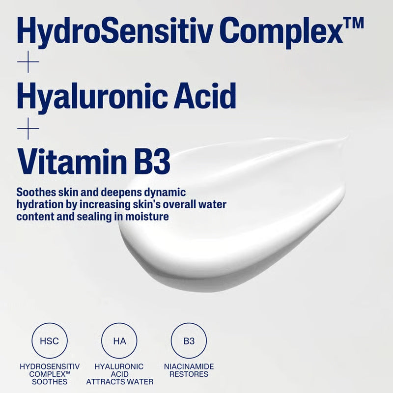 This lightweight cream leaves skin feeling immediately soft and supple. Featuring our HydroSensitiv Complex™, hyaluronic acid, niacinamide, vitamin B5 and antioxidant rich vitamin E to rehydrate and reveal a healthy glow. This formula nourishes and replenishes hydration of skin for 48 hours while improving the quality of sensitive skin overtime. Ideal for sensitive, dry or dehydrated skin. Defends against 5 signs of skin sensitivity including dryness, irritation, roughness, tightness and a weakened skin barrier.